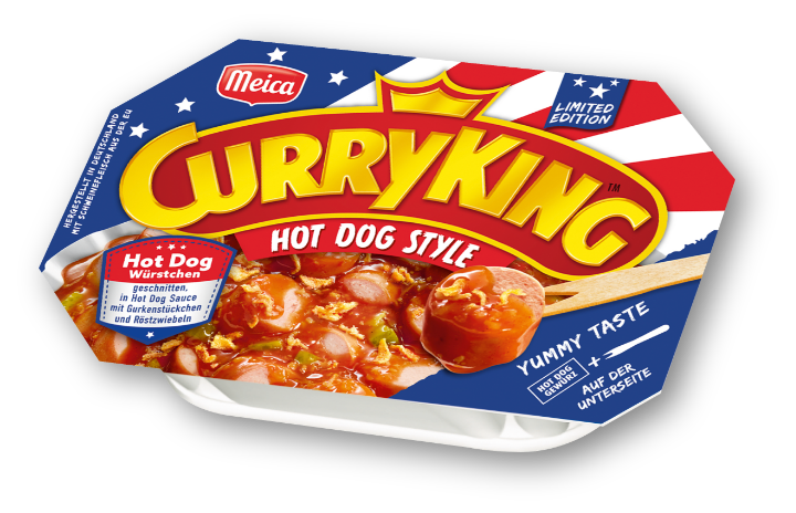 Curry King Hot Dog Style (220 g). Hot dog sausage in hot dog sauce with cucumber pieces and fried onions
